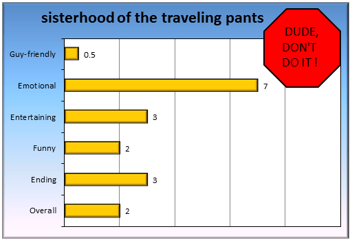 Three (or four?) friends find a pair of pants that fits each of them. The pants fit the tall, cute one; the short, sad one; the not so skinny one and the one that I can’t remember. They spend a summer apart, and send the pants back and forth. Each of the girls learns an important lesson (some not really important).
